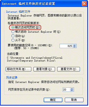 在“检查所存网页的较新版本”中,选择“每次访问网页时”。