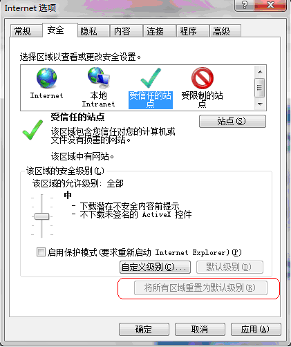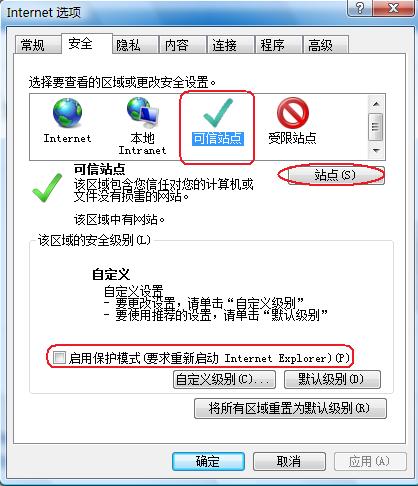 (1) 点击您IE浏览器“工具——Internet选项——安全”,选择“可信站点”,不要选中“启用保护模式”项前的选项框;