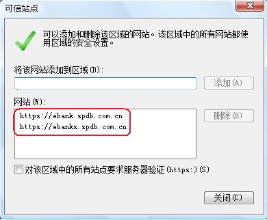 (2) 点击上述页面的“站点”,检查系统是否已将“//ebank.jinbeiyl.com”和“//ebanks.jinbeiyl.com”两个站点列为可信站点;若系统未将这两个站点列为可信站点,请手动进行添加。