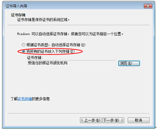 (4) 在证书存储中选择“将所有的证书放入下列存储”,点击浏览。