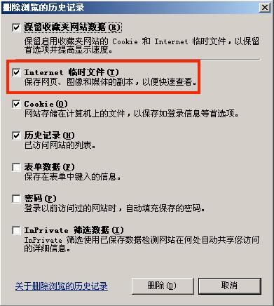 1、 清理IE缓存。以IE8为例,请点击“工具”,选择“删除”,勾选“Internet临时文件”,点击“删除”按钮进行清理。