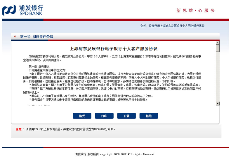 1. 进入首次登录校验流程,阅读并接受《上海浦东发展银行个人网上银行客户服务协议》。
