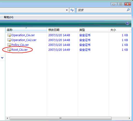 (2) 将b_Cert.zip文件下载并保存至本地后,解压缩到任一目录。在该目录下,双击文件Root_CA.cer。