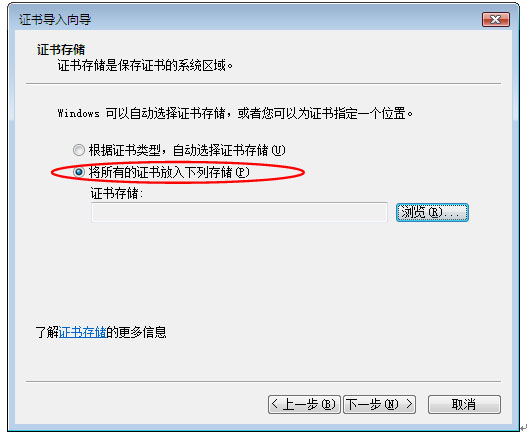 (4) 在证书存储中选择“将所有的证书放入下列存储”,点击浏览。