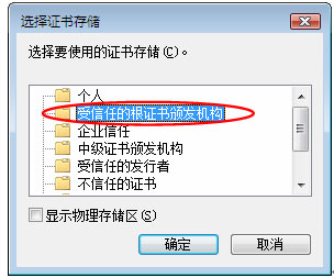 (5) 选择证书存储在“受信任的根证书颁发机构”区域中,并点击“确定”。