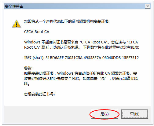 (8) 系统会提示证书安装安全警告,请选择“是”。