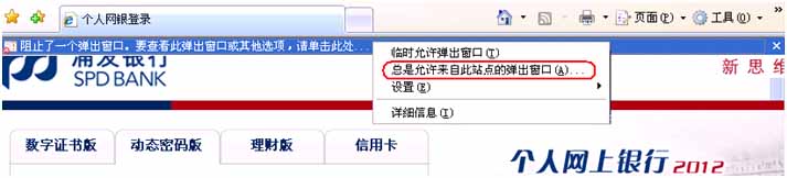这一般是由于您的浏览器设置了安全级别为“高”的弹出窗口拦截选项。点击“登录”后,在地址栏下,会出现“阻止了一个弹出窗口,要查看此弹出窗口或其他选项,请单击此处…”(如下图)。