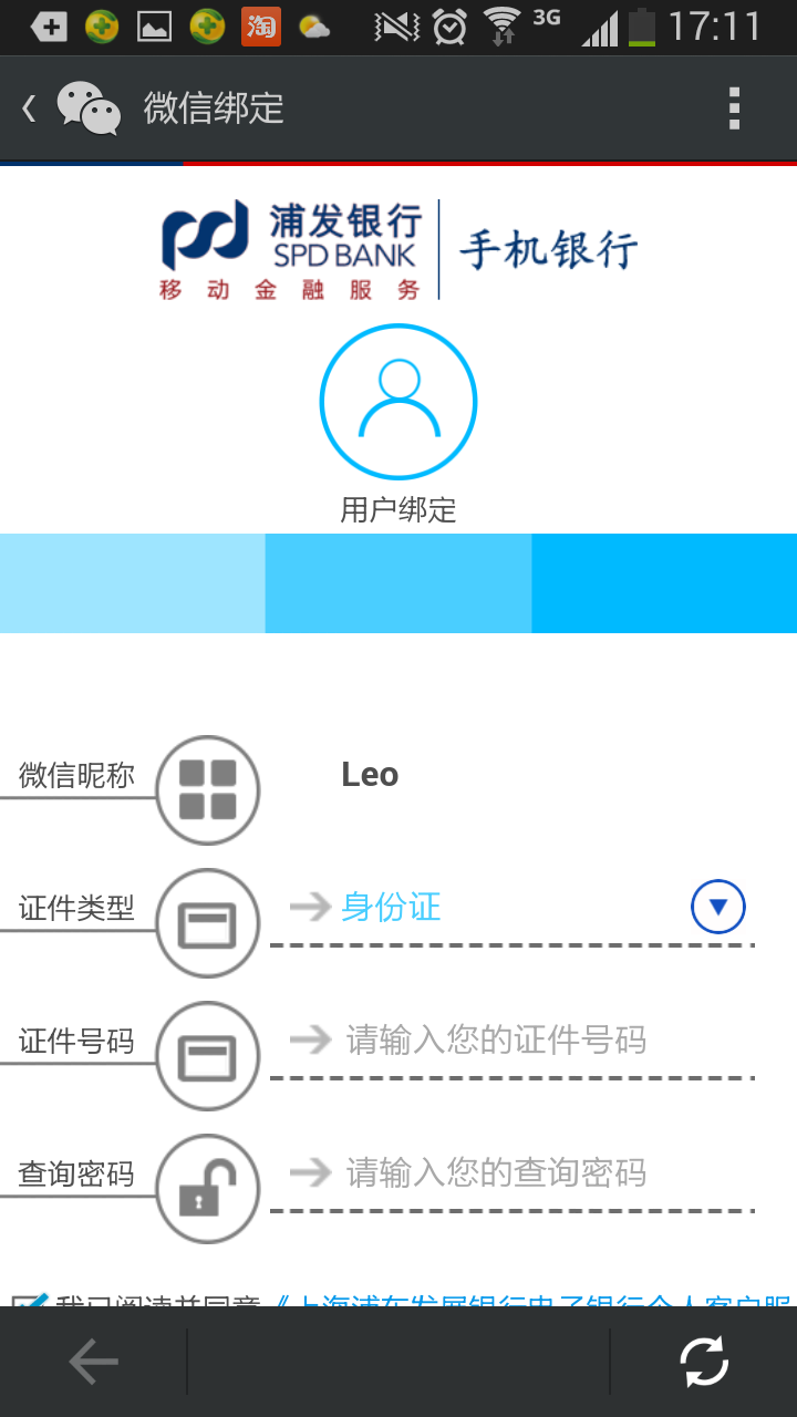 您如果希望微信交互中进行账户信息查询,需预先进行用户身份验证并绑定。