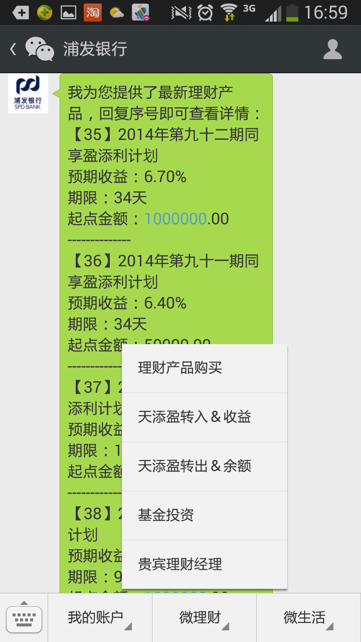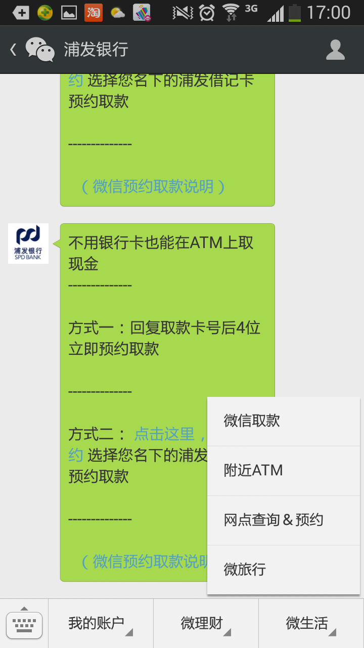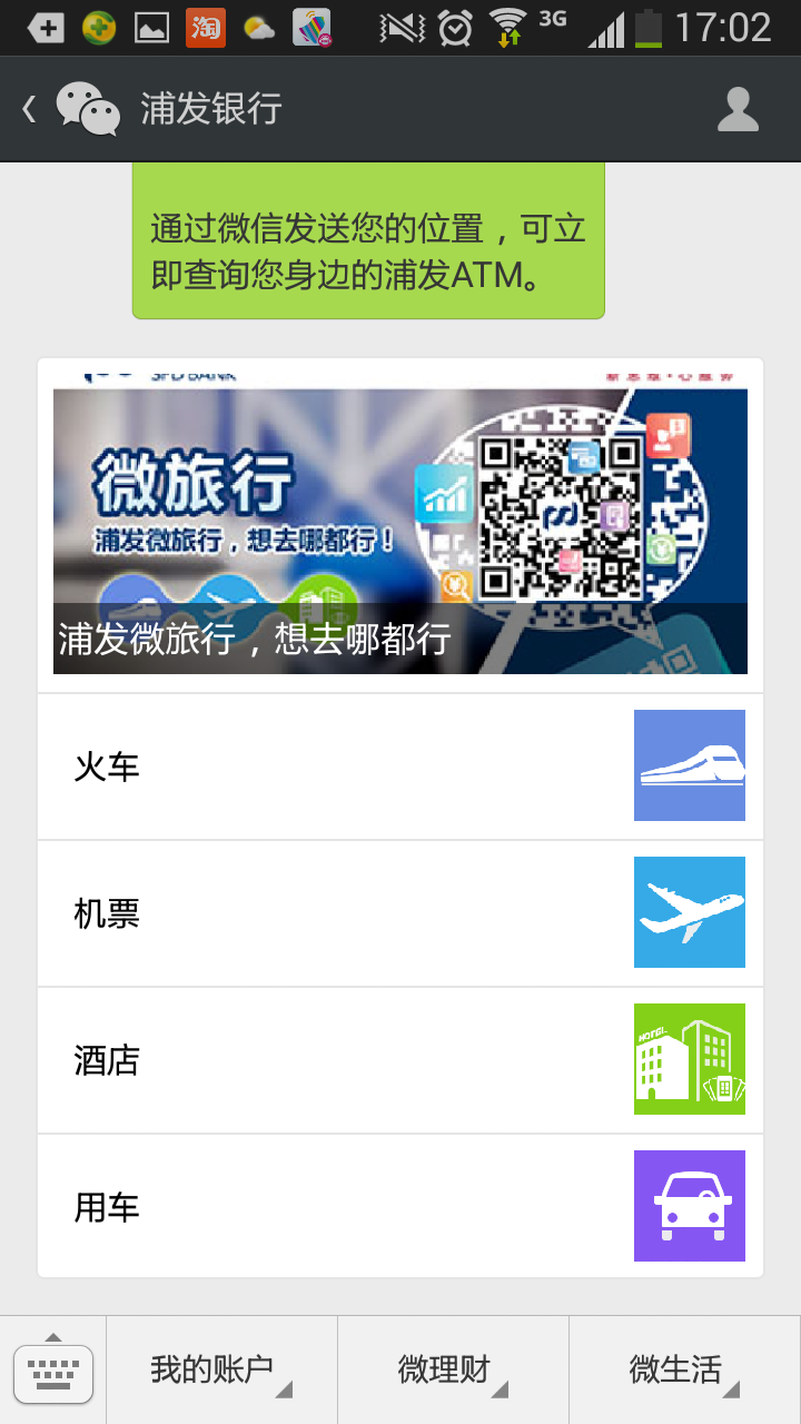 快捷菜单:您可以选择微信底部的功能菜单,发起交易。 目前提供常用的账户查询、理财产品、网点查询与预约功能菜单。